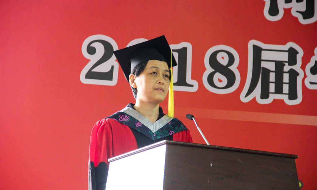 学院党委书记闫峻代表学院向圆满完成学业的全体同学表示最热烈的祝贺,她希望同学们毕业之后牢记母校的嘱托、发扬母校的学风和传统,担负起报效祖国服务人民、不断学习探求真知、追求卓越追求完美的责任。并饱含深情地给同学们提出三点嘱托:一要坚守梦想、二要担起责任、三要面对现实。最后她祝毕业生前程似锦、一生平安幸福。