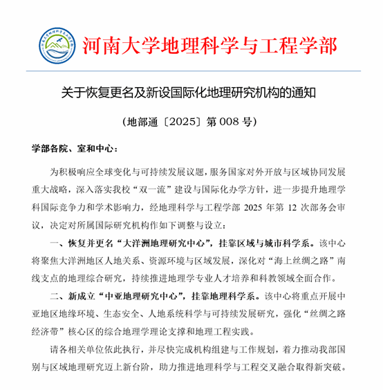苗长虹宣读了地理科学与工程学部“关于恢复更名及新设国际化地理研究机构的通知(地部通〔2025〕第008号)”,强调地理学部将以地理学为核心融合多学科力量,为服务国家“一带一路”倡议、推动区域研究深化与国际合作搭建起高端智力平台。一是恢复更名“大洋洲地理研究中心”,挂靠区域与城市科学系。该中心将聚焦大洋洲地区人地关系、资源环境与区域发展,深化对“海上丝绸之路”南线支点的地理综合研究,持续推进地理学专业人才培养和科教领域全面合作。二是新成立“中亚地理研究中心”,挂靠地理科学系。该中心将重点开展中亚地区地缘环境、生态安全、人地系统科学与可持续发展研究,强化“丝绸之路经济带”核心区的综合地理学理论支撑和地理工程实践。